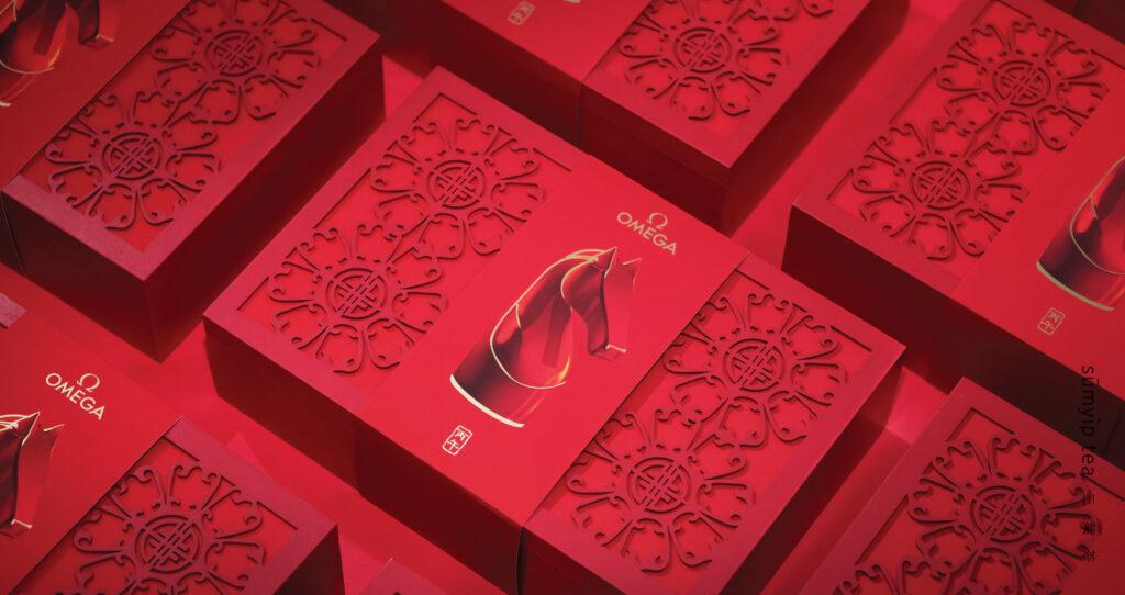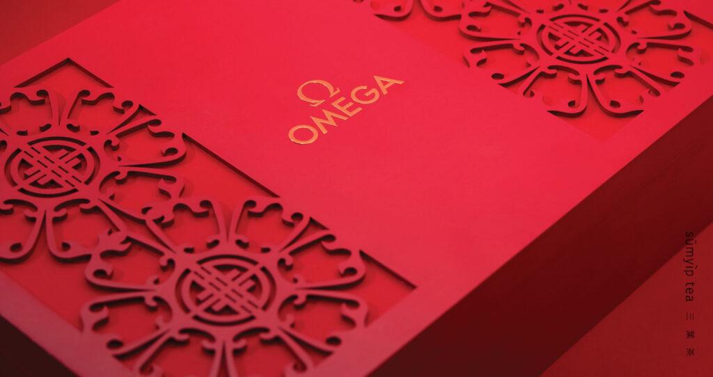 本次禮盒從零開始全程客製化:我們先深入了解Omega的品牌DNA與新年主題需求,然後為這款禮盒設計專屬的紅色大木盒,盒面採用獨家雕花圖案,完全按品牌風格度身訂造,並加入燙金效果提升奢華質感。木盒外層再包裹新年主題紙套,同樣以燙金工藝呈現節慶喜氣。